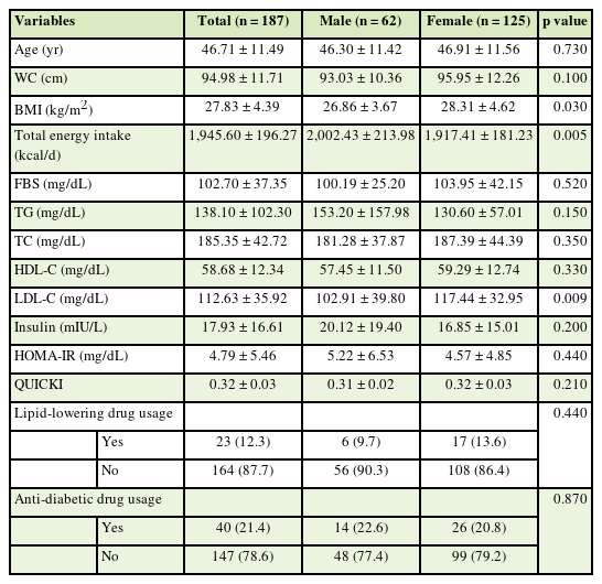 Table 1. It was showed that the mean of BMI and LDL was higher in female than male (p < 0.05). It also revealed that male participants have higher mean of energy intake (p = 0.005). In addition, these individuals had mean blood glucose (102.70 ± 37.32 mg/dL), TC (185.35 ± 42.72 mg/dL), TG (138.10 ± 102.30 mg/dL), HDL-C and LDL-C, insulin level, HOMA-IR, and QUICKI were 58.68 ± 12.34, 112.63 ± 35.92 mg/dL, 93.17 ± 61.16, 4.79 ± 5.46 and 0.03 ± 0.32, respectively. Moreover, the participants had an average insulin level of 93.17 ± 61.16 microns/mL. The frequency of use of hypoglycemic drugs is 40 (21.4%) and the frequency of fat-lowering drugs is 23 (12.3%). These numbers are different in terms of gender.