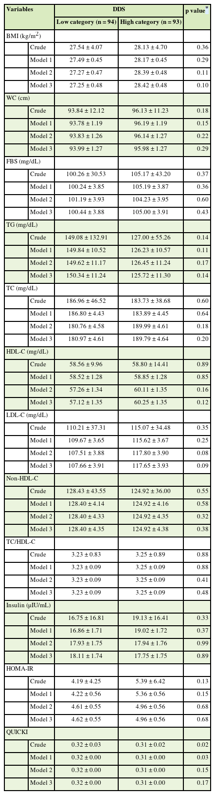 After collecting all the samples, the data of the questionnaires were entered into a computer and final analysis was performed on the information related to 187 subjects. Kolmogorov-Smirnov test was used to check the normal of distribution data. Chi-square test were used for comparison of qualitative variables. We used one-way analysis of variance for quantitative variables and Mann-Whitney tests were used if they were not normal. To describe quantitative and qualitative variables, mean (standard deviation or standard error) and frequency report (percentage) were used, respectively. We classified DDS based on mean to 2 groups. Cardiovascular risk factors (dietary intakes of participants across the medians of DDS was assessed using the analysis of covariance (adjusted for age, gender, BMI, energy intake, and anti-diabetic drugs and Lipid-lowering drugs usage). Linear regression was used to investigate the relationship between the DDS and CVD risk factors in crude and adjusted models (adjusted for age, gender, BMI, energy intake, anti-diabetic drugs and Lipid-lowering drugs usage). Spearman was performed to evaluate the correlation between the DDS and cardiovascular biomarkers. Statistical analysis performed using SPSS software version 22 (IBM Corp., Armonk, NY, USA) and p < 0.05 was considered as statistically significant.