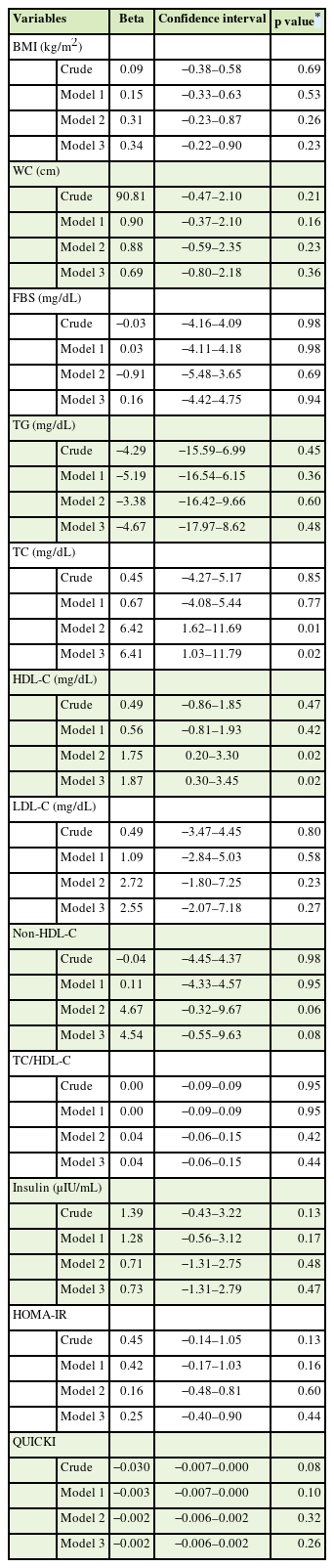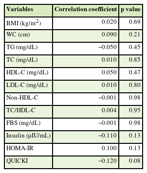 31] and serum insulin was measured by electrochemiluminescence immunoassay method (Diagnostic Biochem Canada, Inc., Montreal, Canada). We subtracted the concentration of HDL-C from that TC to determine the non-HDL-C level. Moreover, insulin sensitivity was calculated by the following formulas according to quantitative insulin sensitivity check index (QUICKI = 1/(log(fasting insulin, µU/mL) + log(fasting glucose, mg/dL)) [