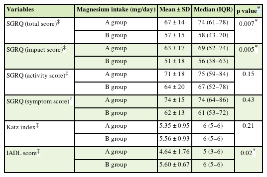 • An insufficient intake of magnesium may be associated with the development of chronic obstructive pulmonary disease (COPD). We aimed to determine the relationship between health related quality of life (QoL), anthropometric indices and nutritional status with dietary magnesium intake in COPD patients. Sixty-one COPD patients participated in this cross-sectional study. QoL and nutritional status were assessed. Furthermore, body composition, calf circumference, and muscle strength were measured; equations were used to calculate fat-free mass index, body mass index, and muscle mass value. Dietary magnesium intake was assessed by three 24-hours recalls and magnesium intake was categorized as ≤ 188.08 mg/day (A group) and > 188.08 mg/day (B group). The χ2, independent-sample t-test and Mann-Whitney test were used for statistical analysis. The p values less than 0.05 were considered significant. Of QoL assessments the total and impact mean scores of St. George's respiratory questionnaire in the B group were significantly lower than the means of the A group (p value = 0.007 and 0.005, respectively). The instrumental activity of daily living score was significantly improved in patients with higher consumption of dietary magnesium (p = 0.02). Participants had a significantly lower mean score of patient-generated subjective global assessment in the B group compared to the A group (p = 0.003). Higher intake of dietary magnesium can lead to improve QoL and nutrition status.