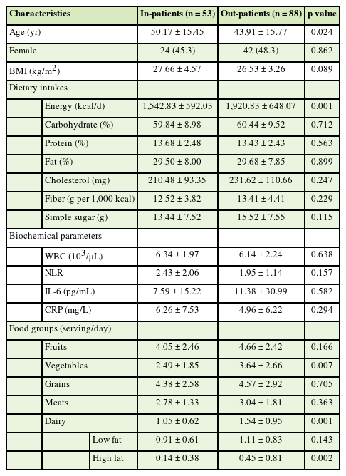 The basic characteristics of participants including dietary intake and biochemical parameters are shown in Table 1. Inpatients had lower energy intake, around 400 kcal per day, compared to outpatients. In terms of biochemical parameters, no significant differences were observed between the 2 groups. As can be seen, outpatients consumed significantly more servings of vegetables and dairy compared to inpatients, while no significant difference was observed in other food groups. Interestingly, high-fat dairy intake was significantly higher in hospitalized patients than in outpatients. Table 2 presents the basic characteristics of participants across the dairy intake tertiles.