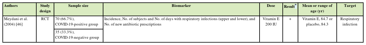 Vitamin E has not been studied for its effect on COVID-19, and only one study was related to respiratory infections. The number of respiratory infections was significantly lower in the vitamin E intake group (200 IU, 84.7 years) than in the vitamin E non-intake group (84.3 years) [