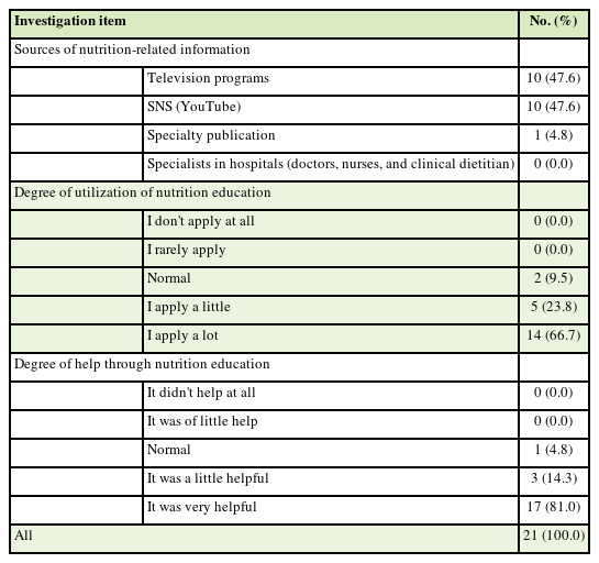 The patients were inquired about the source of nutrition-related information—‘TV programs,’ ‘SNS (YouTube),’ ‘specialty publication, ‘Specialists in hospitals (doctors, nurses, clinical dietitian)’. Education needs were surveyed for 2 times (before surgery, 2nd chemotherapy), and the degree of utilization of nutrition education resources was investigated during the last (4th) interview (2nd chemotherapy). The patients were asked to directly check the relevant questions in the questionnaire, and the degree of application of nutrition education was evaluated as ‘not applied at all,’ ‘almost not applied,’ ‘normally,’ ‘applied a little,’ ‘applied a lot’ on a 5-point scale.