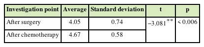 According to biochemical analysis results, hemoglobin, total protein, albumin, and lymphocyte levels after surgery were the lowest among all stages during the study period, and WBC levels were the lowest during 2nd chemotherapy. Since stress response and catabolism increase after surgery, the plasma protein level may lower temporarily, and hemoglobin can be lowered in case of bleeding [