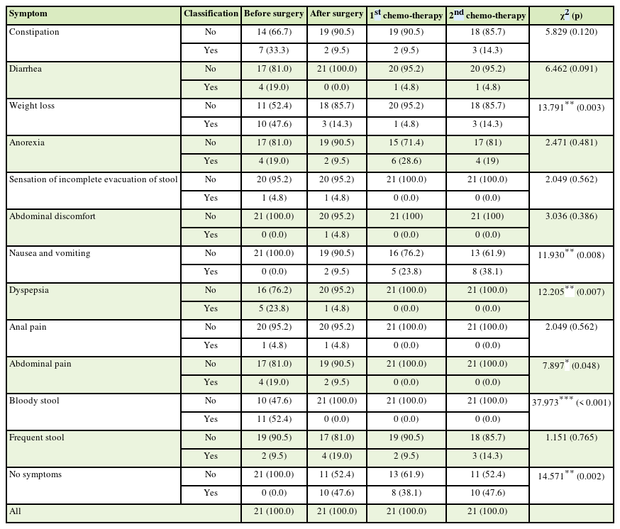 The presence or absence of symptoms experienced by the patients was investigated through interviews conducted 4 times during the study period (before surgery, after surgery, 1st chemotherapy, 2nd chemotherapy) and medical records. Symptoms included constipation, diarrhea, weight loss, anorexia, sensation of residual stool, abdominal discomfort, nausea and vomiting, dyspepsia, anal pain, abdominal pain, bloody and frequent stool. As the symptoms experienced by patients may vary depending on the treatment process, multiple responses were made for this survey item.