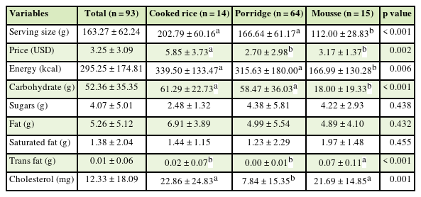 Table 1. The average serving size of a staple food product was 163.27 g, the price was 3.25 US dollars (4,498.38 won), and the energy content per serving was 295.25 kcal. Cooked rice had the greatest serving size, price, energy, carbohydrate, and cholesterol content, but the trans fat content was significantly greater in mousse (p < 0.05).