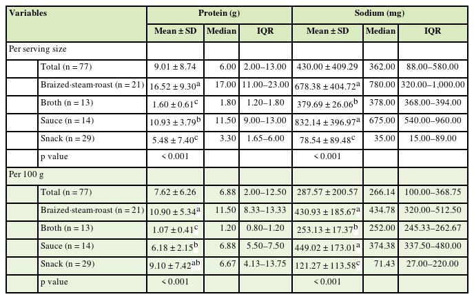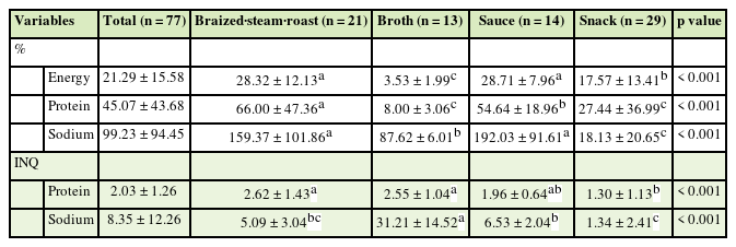 In this study, there were no significant differences in sodium content or contribution to DRI among staple senior-friendly foods by type, but the INQ of sodium was significantly greater in mousse and porridge than in rice. These findings suggest that rice is a good choice for reducing sodium intake when choosing staple foods for elderly people. In this study, the sodium content and contribution to DRI were significantly greater in sauces and braized·steam·roast products, while the sodium INQ was significantly greater in broth. Choi et al. [