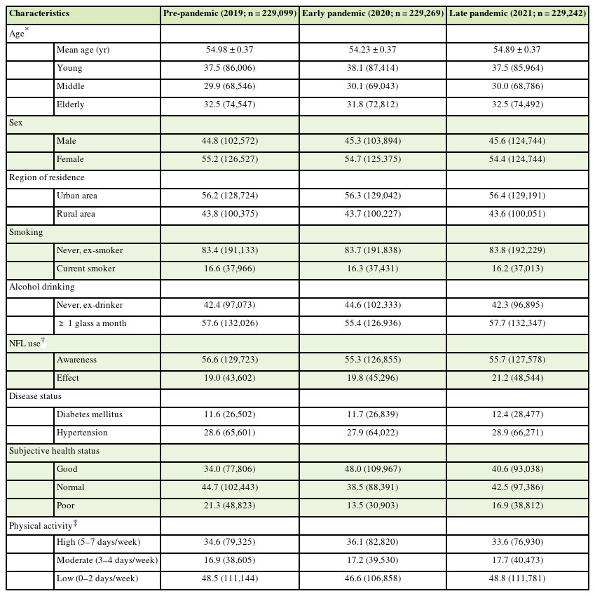 The current study compared the prepandemic (2019), early pandemic (2020), and late pandemic (2021) periods in terms of NFL use. The prepandemic year was the most recent year before the outbreak of COVID-19 in Korea; therefore, 2019 was regarded as the ‘prepandemic’ reference year.
