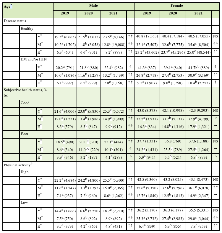 The inclusion criterion was Korean adults aged 19 and over. The subjects were divided into 3 age groups within the male and female categories: 19–49 years (young), 50–64 years (middle-aged), and 65 years and over (elderly), which was similar to the tertile distribution of all populations. Thus, participants in this study were divided into the following subgroups: the healthy group vs. the diabetes mellitus (DM)/hypertension (HTN) group; the good subjective health status group vs. the poor subjective health status group; and the high physical activity group vs. the low physical activity group.