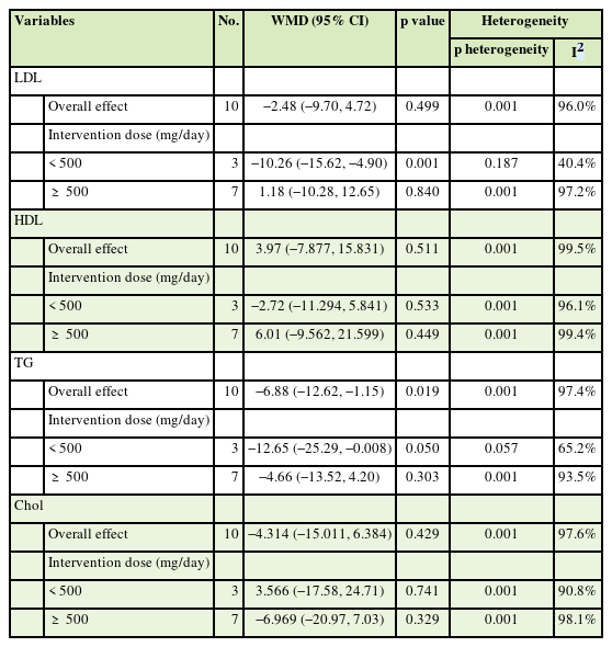 The results of the current study, demonstrate a significant overall reduction in TG with cinnamon supplementation (WMD, −6.88; 95% CI, −12.62, −1.15). Stratification by intervention dose reveals a more substantial reduction for doses less than 500 mg/day compared to 500 mg/day or more. Comparing these findings with existing literature, there is some agreement with studies reporting a TG-lowering effect of cinnamon [