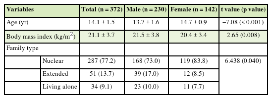 2, p < 0.01). Family type also differed significantly by sex, with girls reporting a higher proportion of nuclear families and boys reporting a higher proportion of extended families (p < 0.05).