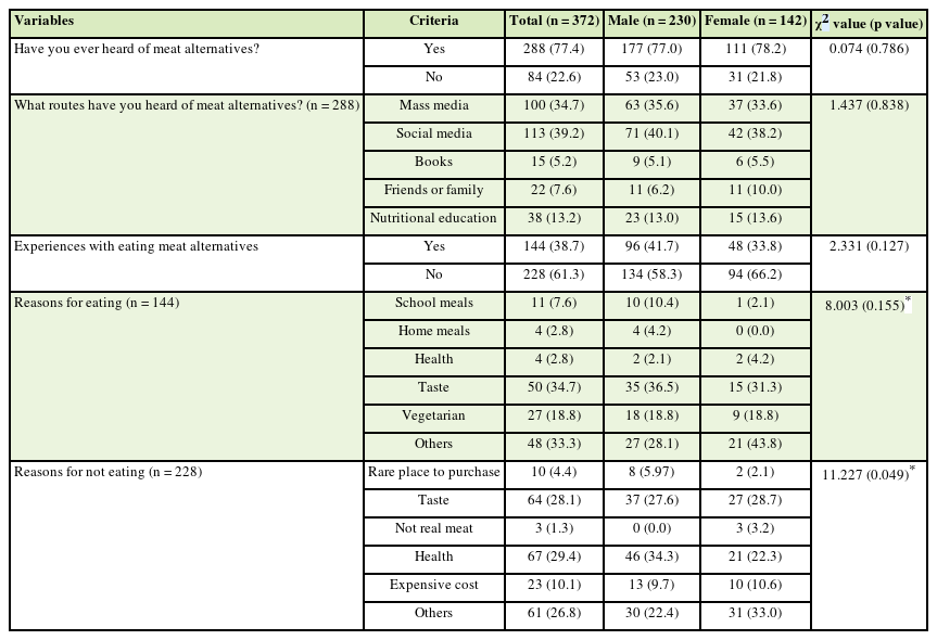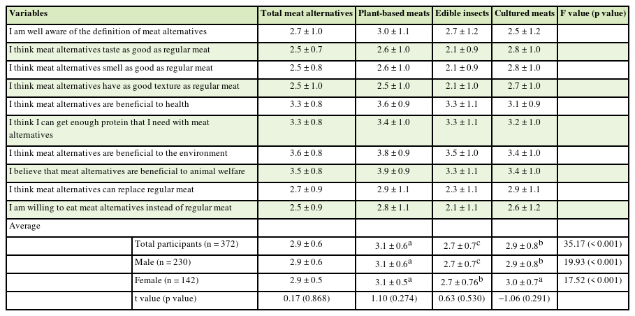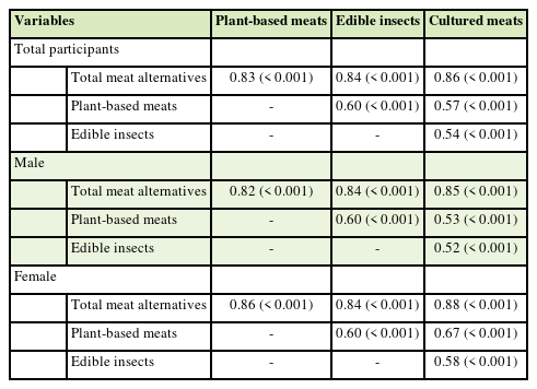 Statistical analysis was conducted using SAS version 9.4 (SAS Institute Inc., Cary, NC, USA). Means, standard deviations, and frequencies were calculated for participants’ general characteristics and their experiences with and perceptions of meat alternatives. Differences between male and female students were analyzed using independent samples t-tests for continuous variables and χ2 tests for categorical variables. Reliability analysis of the 10-item questionnaire assessing the perceptions of plant-based meats, edible insects, and cultured meats yielded Cronbach’s α values of 0.796, 0.839, and 0.906, respectively. According to Cortina (1993), Cronbach’s α between 0.7 and 0.9 is generally considered acceptable, indicating that the internal consistency of the items for each category of meat substitutes used in this study was reliable. Differences in perceptions across the 3 categories of meat alternatives were analyzed using one-way analysis of variance, followed by Duncan’s multiple-range test to assess significance. Pearson’s partial correlation analysis was used to examine the relationships among perceptions, adjusting for age, BMI, and family type. Statistical significance tests were performed at the p < 0.05 level.