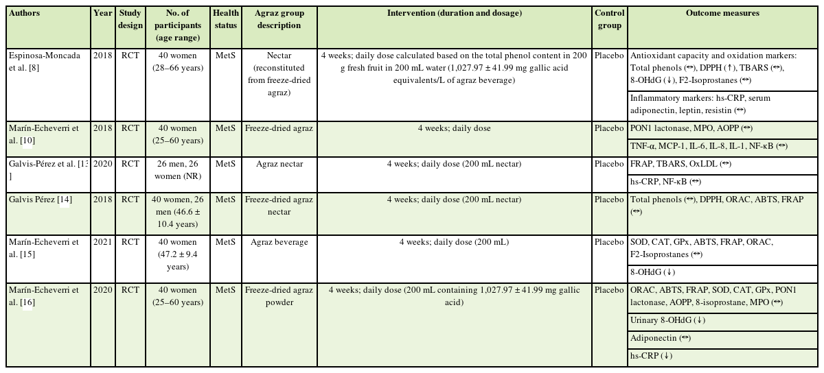 Marín-Echeverri et al. [15] 2021 RCT 40 women (47.2 ± 9.4 years) MetS Agraz beverage 4 weeks; daily dose (200 mL) Placebo SOD, CAT, GPx, ABTS, FRAP, ORAC, F2-Isoprostanes (↔)