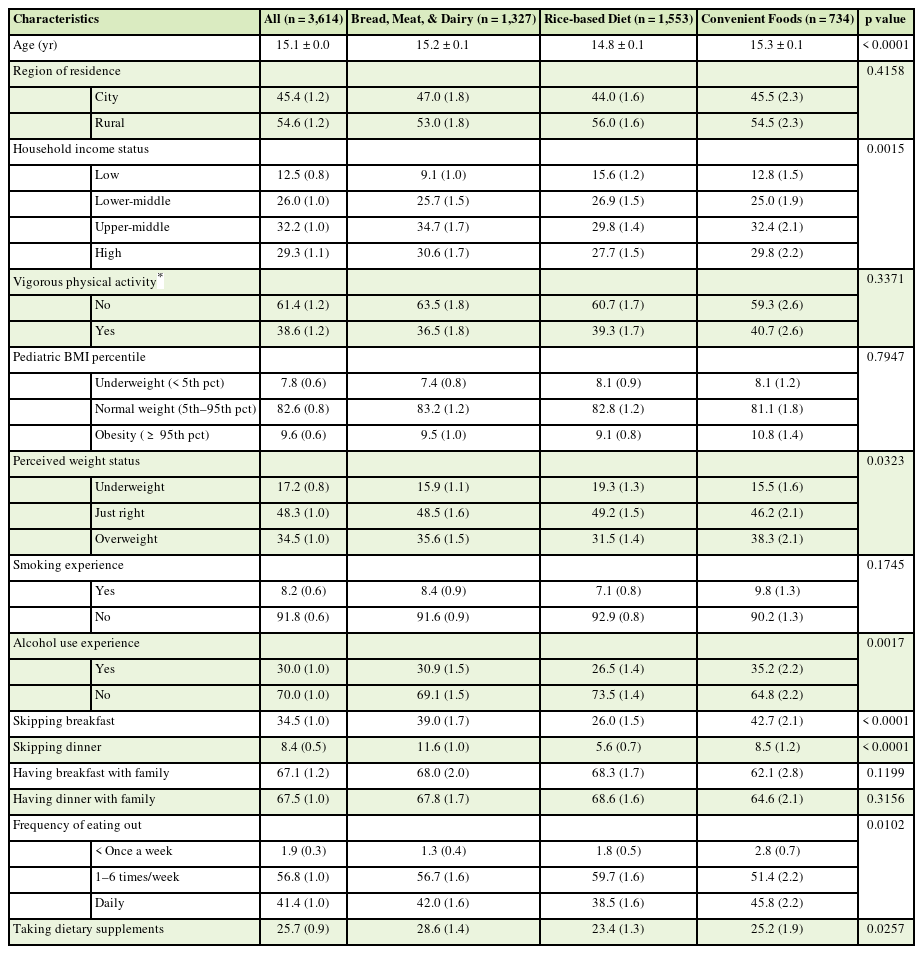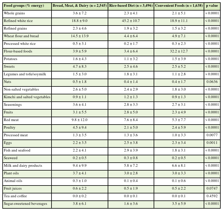 Table 1Dietary pattern analysis using cluster analysis: mean percentage of energy intake from food groups among Korean adolescents