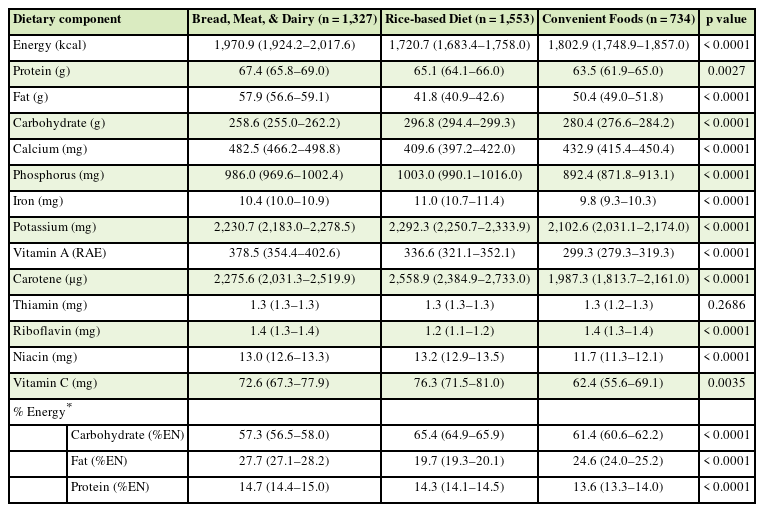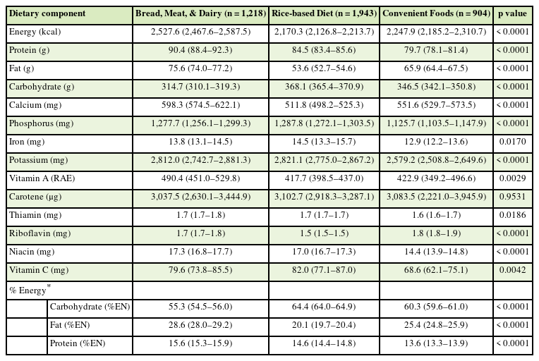Table 1). Each cluster was characterized by predominant food group consumption patterns and labeled accordingly. The first cluster, representing 33.1% of the population (n = 2,545), was characterized by relatively high consumption of wheat flour and bread, red meat, poultry, and milk and dairy products. This cluster was labeled the Bread, Meat, & Dairy group. The second cluster, comprising 45.5% of the population (n = 3,496), was marked by a notably high intake of refined white rice and was designated the Rice-based Diet group. The third cluster, including 21.3% of participants (n = 1,638), was distinguished by high consumption of flour-based convenience foods such as noodles, ramyeon, udon, hotdogs, hamburgers, sandwiches, pizza, and dumplings. This cluster was labeled the Convenient Foods group.