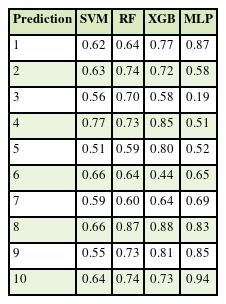 In contrast, the RF and XGB models exhibited slightly higher accuracy on the training data but tended to overfit the small and imbalanced dataset. Similarly, although the MLP model demonstrated potential for nonlinear feature learning, it showed unstable convergence due to the limited sample size.