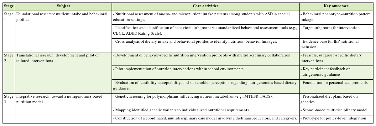 • Expected outcomes: This integrative stage aims to produce a prototype for a school-based, nutrigenomics-informed nutrition care model that involves practical coordination among dietitians, genetic counselors, educators, and families. The expected outcomes include improved behavioral regulation, enhanced nutritional adequacy, and strengthened home–school collaboration in implementing personalized dietary strategies. Ultimately, this model aims to serve as a validated framework for the policy-level integration of clinical nutrition into special education systems, thereby advancing both equity and personalization in ASD care.
