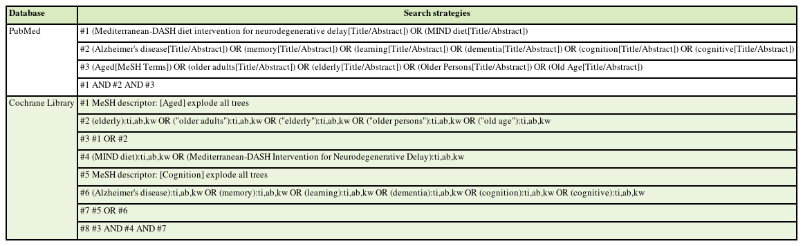 Therefore, this study aimed to systematically review the existing literature to clarify the effect of the MIND diet on the cognitive function of older adults. The findings may serve as foundational evidence for the development of dietary guidelines tailored to the cognitive health needs of older Korean adults.