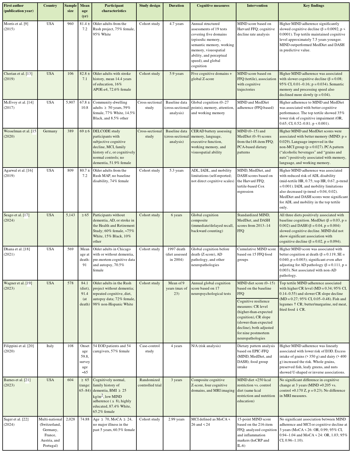 22]. These studies were conducted in different countries, including the United States, Germany, Italy, and Switzerland, and most included predominantly White individuals (> 75%). These studies included 7 cohort studies, 2 cross-sectional studies, 1 RCT, and 1 case-control study. Regarding study duration, 7 studies exceeded 3 years, 2 lasted ≤ 3 years, and the 2 cross-sectional studies were categorized separately. The number of participants varied across studies, ranging from 106 to 5,143, totaling 17,201 individuals enrolled in the 11 selected studies. All studies were conducted among adults aged ≥ 57 years. Dietary adherence was assessed in all studies using the MIND diet score (0–15) based on the food frequency questionnaires, whereas cognitive function was evaluated using various standardized assessment tools. Most studies indicate that the MIND diet preserves the cognitive function of older adults, whereas some have shown associations with improved cognitive resilience (CR) and the prevention of early-onset dementia (EOD). In contrast, two studies did not report any significant effects.