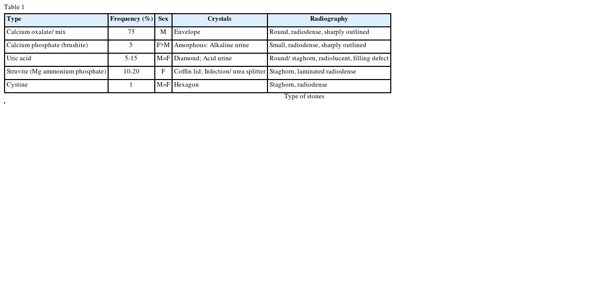 Table 1 describes the various types of kidney stones and their prevalence. Approximately 70-80% of kidney stones are composed of calcium oxalate and calcium phosphate. Of the rest, 10% are struvite, 10% of uric acid; and less than 1% are composed of cystine or are diagnosed as drug-related stones. Calcium and uric acid stones are more common in men; women have more struvite stones.