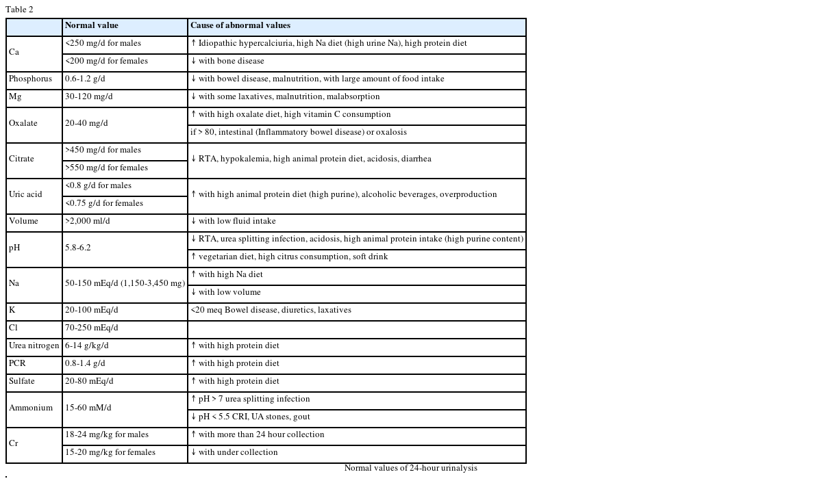 Table 2 provides a summary of the normal values for the 24-hour urine collection and likely causes of abnormal values. The 24-hour urine sample should include volume, and the solutes calcium, phosphorus, oxalate, citrate, pH, and uric acid to provide an estimate of supersaturation and the risk of stone formation. Creatinine is tested to ensure full collection and to normalize solute excretion to the more constant amount of creatinine. Dietary factors include sulfates which are mostly from animal protein and sodium since they are related to calcium, potassium, and magnesium excretion. Urea nitrogen is used to estimate protein catabolic rate (PCR). The PCR is usually indicative of dietary protein intake in an individual who is not in a catabolic state. The relationship between urinary nitrogen appearance rate and estimated dietary protein intake is then calculated. The value of the 24-hour urine is to evaluate dietary nutrients and fluid intakes and to provide guidance for the patient's management. For example, normal urinary calcium levels are <250 mg/d for men and <200 mg/d for women. High urinary calcium may be caused by idiopathic hypercalciuria, or diet high in sodium or protein. Low urinary calcium is often due to malabsorption or underlying bone disease. A normal urinary oxalate level is 20-40 mg/d. High levels are due to high oxalate diet, increased endogenous production, high vitamin C consumption and irritable bowel disease. Normal urinary citrate levels are >450 mg/d for men and >550 mg/d for women. High animal protein diets and renal tubular acidosis (RTA) can increase acid production affecting urinary pH so that it declines citrate levels.