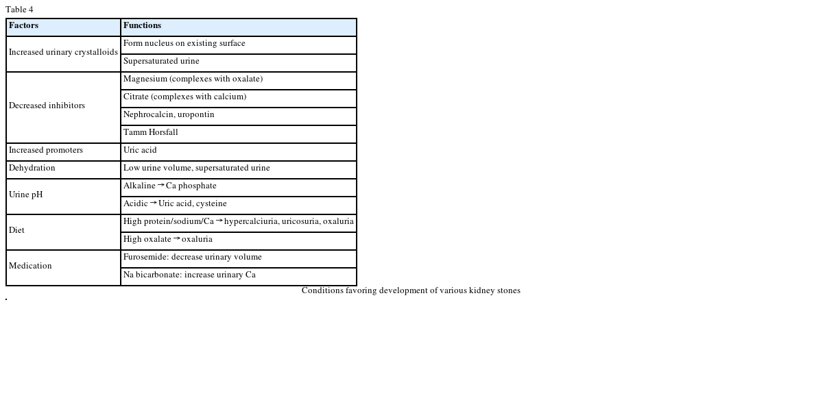 Table 4 shows the conditions that favor stone formation. Urinary crystalloids can form nucleus on the existing surface and supersaturate urine. Low urinary magnesium causes decrease complex formation with urinary oxalate allowing free oxalate to be more available in the urine. Low urinary citrate also increases stone formation because citrate forms a complex with calcium so free calcium is more available for stone formation. High concentrations of uric acids in the urine will promote the nuclei to start stone formation. If the patient is dehydrated, he or she will have low urine output and therefore the urine can be supersaturated. Urine pH is very important for the formation of some types of stones. For example, low urine pH is favorable to formation of CaOx and uric acid stones while a high urine pH promotes CaP stone formation.