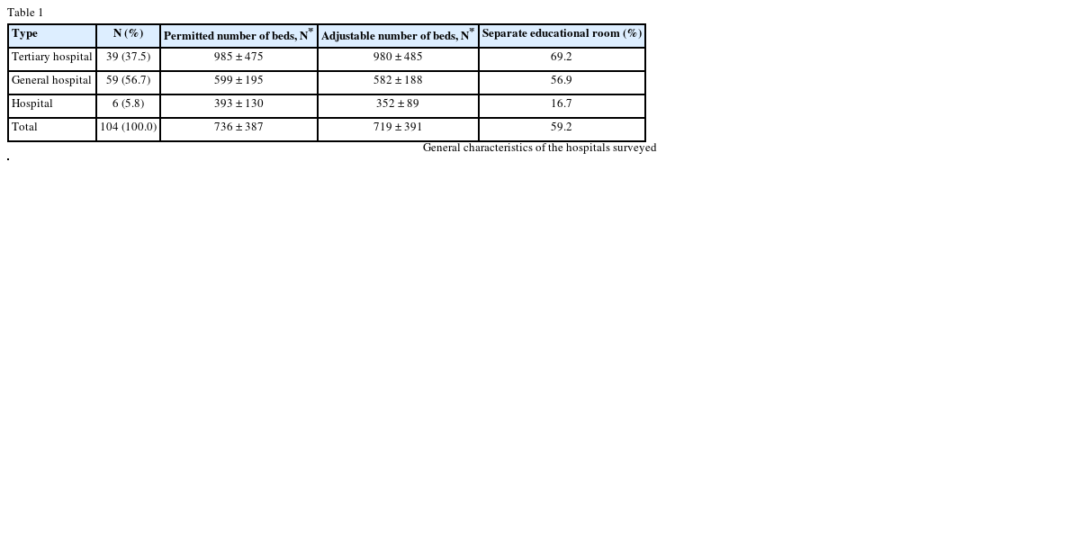 Of the 104 hospitals that participated in this study, 39 (37.5%) were tertiary hospitals, 59 (56.7%) general hospitals, and 6 (5.8%) hospitals. The number of permitted beds was highest in tertiary hospitals, average 985, followed by general hospitals, 599, and hospitals, 393. Also, 69.2% of tertiary hospitals, 56.9% of general hospitals, and 16.7% of hospitals had a separate nutrition education rooms (