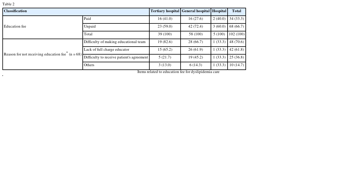 Table 2 shows the reasons why the subject hospitals receive or do not receive dyslipidemia-related education fees. Of the subject hospitals, 66.7% do not receive the dyslipidemiarelated education fee and 48 hospitals of them responded that it was because of 'difficulty of making an education team.'