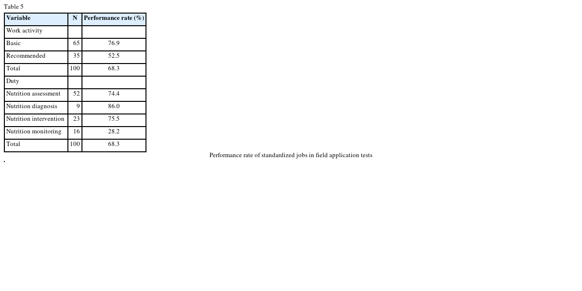 When the job standards were applied to the hospitals, of the 65 basic tasks, 76.9% was performed and, of the 35 recommended services, 52.5% was performed. Also, in terms of duties, 74.4% of the 52 nutrition assessment tasks, 86.0% of the 9 nutritional diagnosis tasks, 75.5% of the 23 nutrition intervention tasks, and 28.2% of the 16 nutrition monitoring and evaluation tasks were performed (