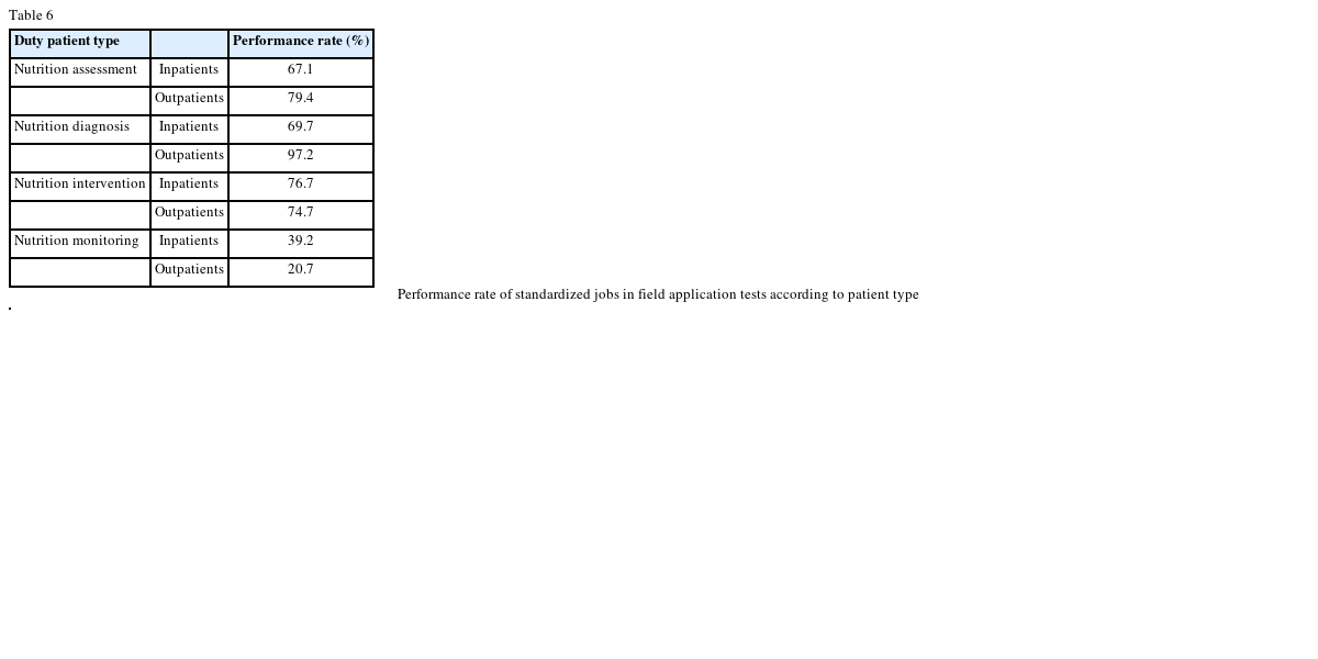 Table 6 presents the result of studying job performance by duty according to types of dyslipidemia patients. The performance rates of nutrition assessment, nutritional diagnosis, nutrition intervention, and nutrition monitoring and evaluation for inpatients were 67.1%, 69.7%, 76.7%, and 39.2%, respectively, and, for outpatients, 79.4%, 97.2%, 74.7%, and 20.7%.