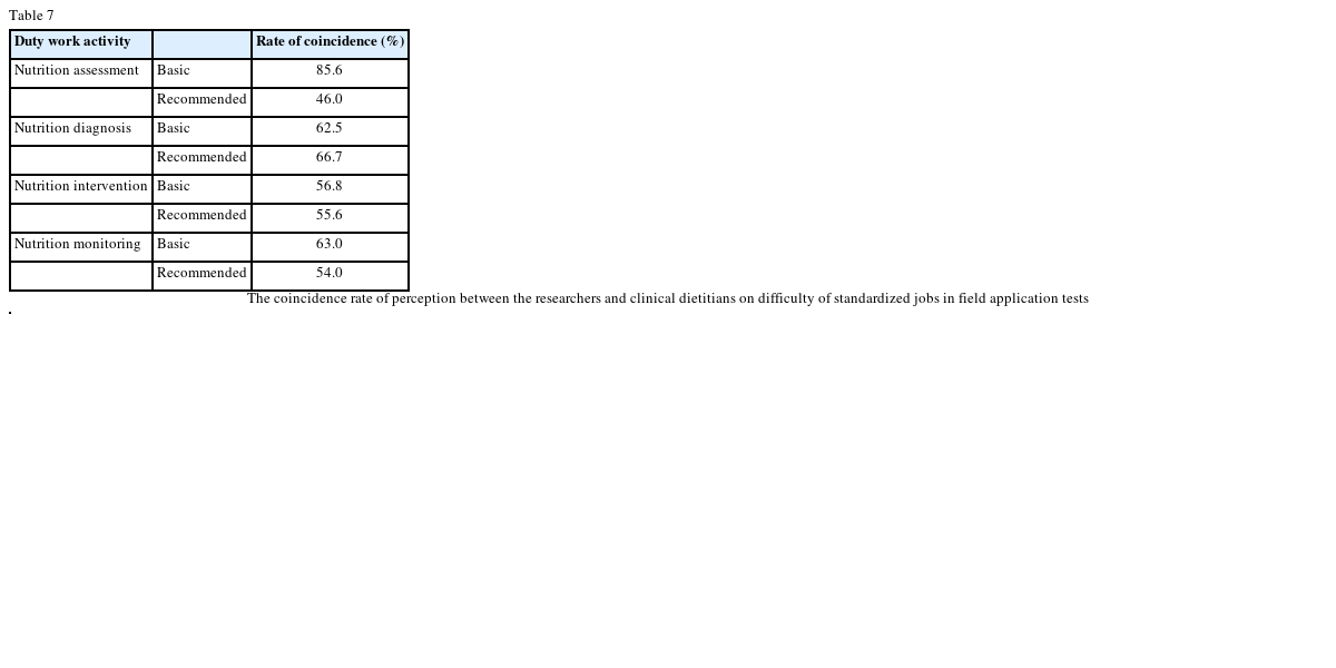 For field application evaluation, 10 medical institutions among those with most trainings on dyslipidemia were selected based on the size and region of institution. The survey included job performance, difficulty, and job standard form evaluation, and, for job performance, performance of each task element was studied at each medical institution based on medical records of three cases of clinical nutrition service. Also, task difficulty was recorded based on 'basic service' and 'recommended service' according to practical experience of the subjects, while the job standards form was evaluated by having the subjects write their opinion on changes that need to be made.