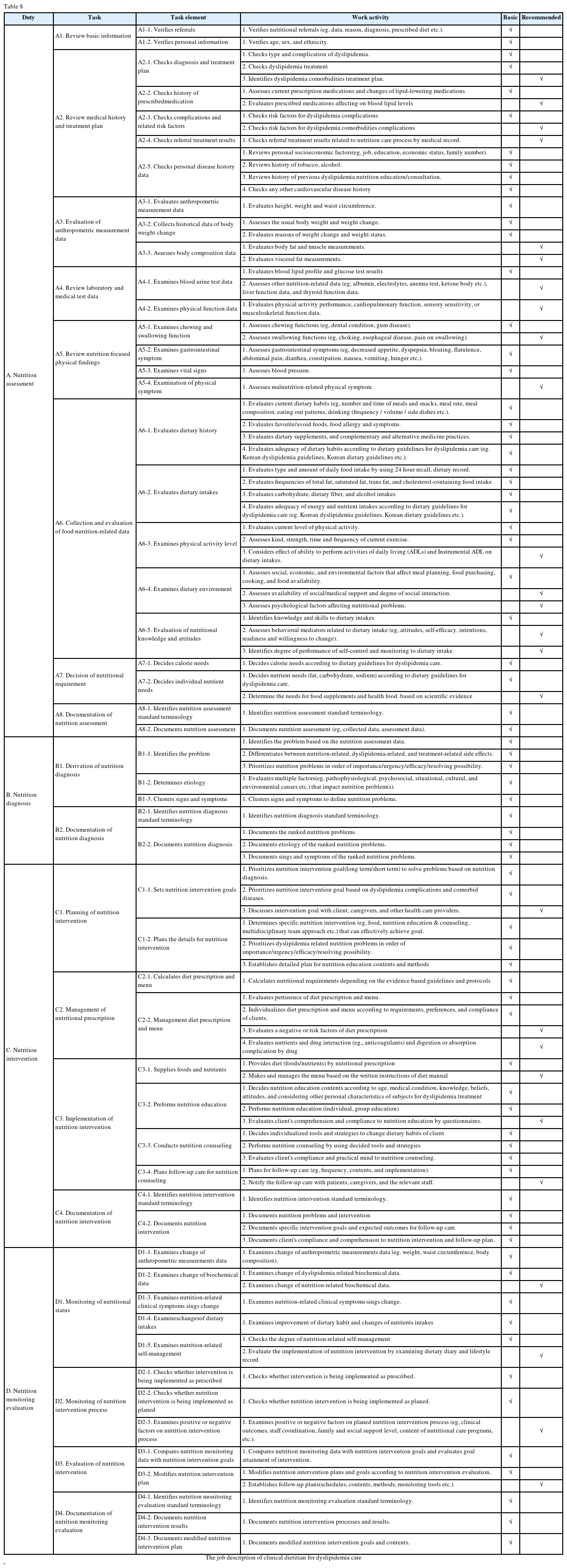 Based on these job descriptions, a specific job description was added to each task element and the tasks were classified as 'basic' and 'recommended.' 'Basic' means basic tasks that clinical dietitians must perform, whereas 'recommended' means tasks performed by experienced professional dietitians for dyslipidemia.