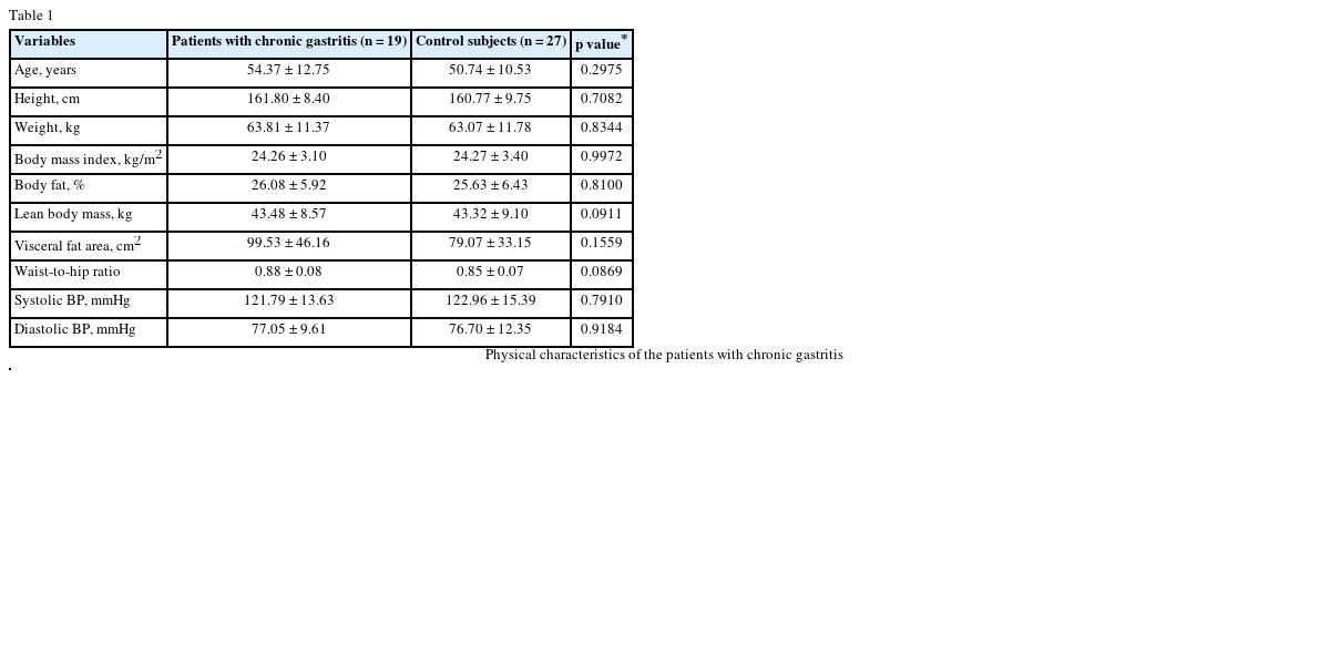 In the nutritional intake assessment, we did not find any significant differences in daily intakes of energy and nutrients in the chronic gastritis patients compared to those in the healthy control group except cholesterol intake. The daily energy intake of the chronic gastritis patient group was 1,900.6 kcal or 86.3% of Estimated Energy Requirement [