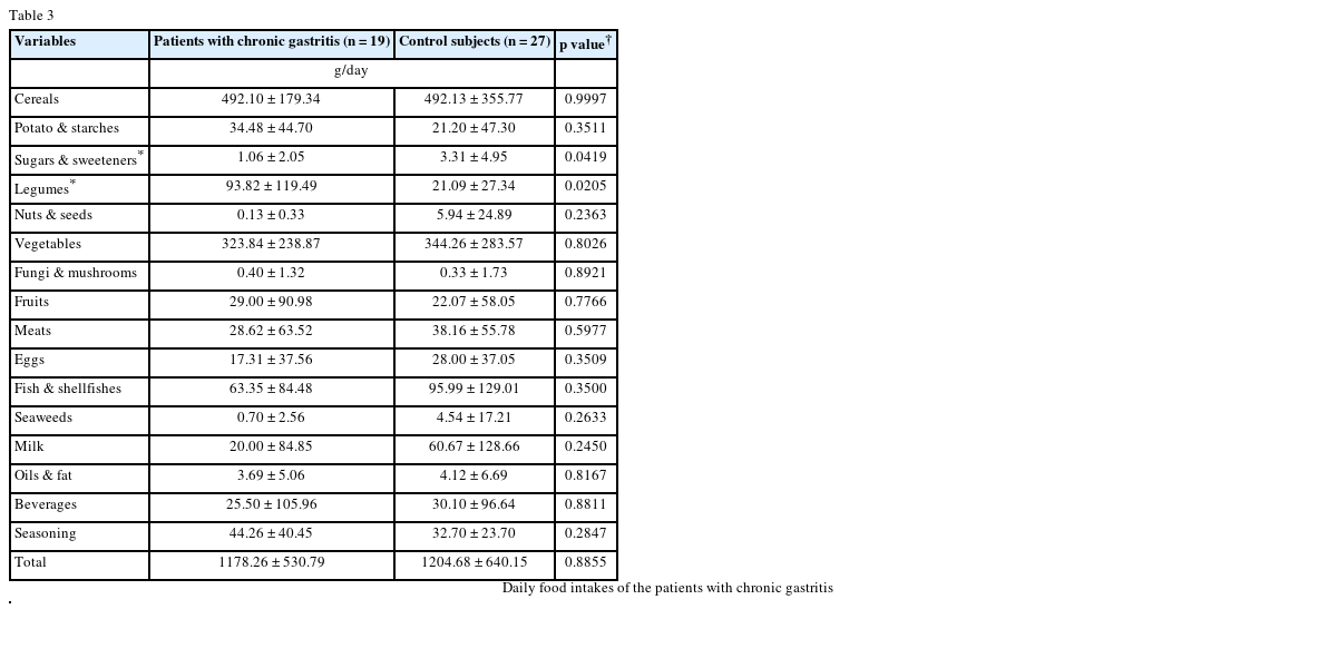 Table 2, daily energy intakes were 1,900.6 kcal for the chronic gastritis patient group and 1,931.8 kcal for the normal control group without differences. No significant difference was found between the two groups in all nutrient intakes except cholesterol. The mean cholesterol intake of the chronic gastritis patients was 158.6 mg/day, and significantly lower than that of the normal control group (308.7 mg/day, p < 0.05). The chronic gastritis group consumed significantly less sugars than the normal control group while, they tended to consume more starchy foods, such as potatoes and legumes, than the normal control group (