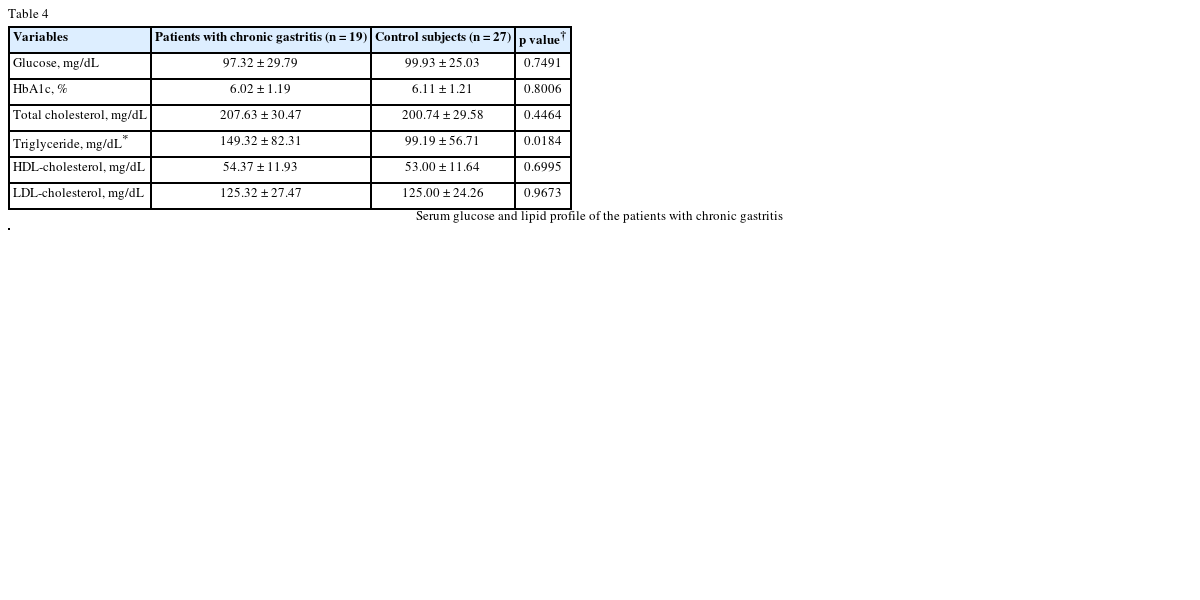 Table 4Serum glucose and lipid profile of the patients with chronic gastritis