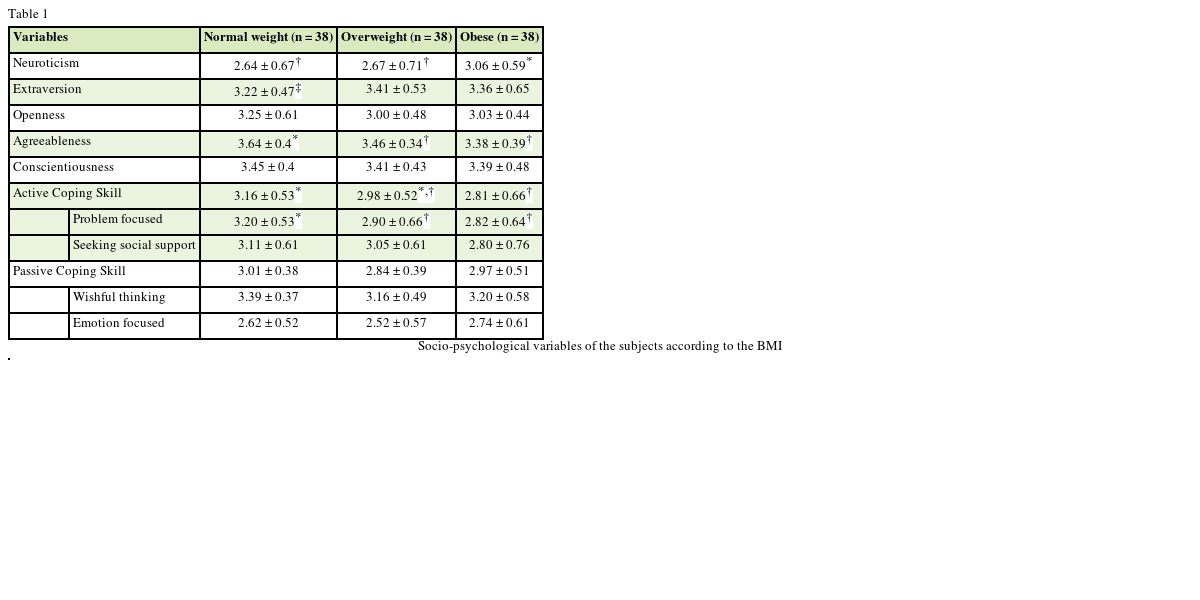 Socio-psychological variables of the subjects are shown in Table 1. Neuroticism received a significantly higher score in the obese group than the other two groups (3.06 ± 0.59); however, agreeableness received a significantly lower score in the obese group than the other two groups (3.38 ± 0.39) (p < 0.05). Active coping had a significantly lower score in the obese group than the normal and overweight groups (2.81 ± 0.66) (p < 0.05). Problem-focused received a significantly lower score in the overweight and obese groups than the normal weight group (2.90 ± 0.66 and 2.82 ± 0.64, respectively, p < 0.05).