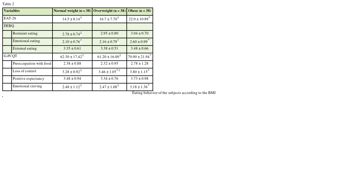 Eating behaviors (EAT-26, DEBQ, and G-FCQ-T) of the subjects according to the BMI are summarized in Table 2. On eating behavior analyses, EAT-26 score of the obese group was significantly higher (22.0 ± 10.89) than other groups (14.5 ± 8.14, 16.7 ± 7.70) (p < 0.05).