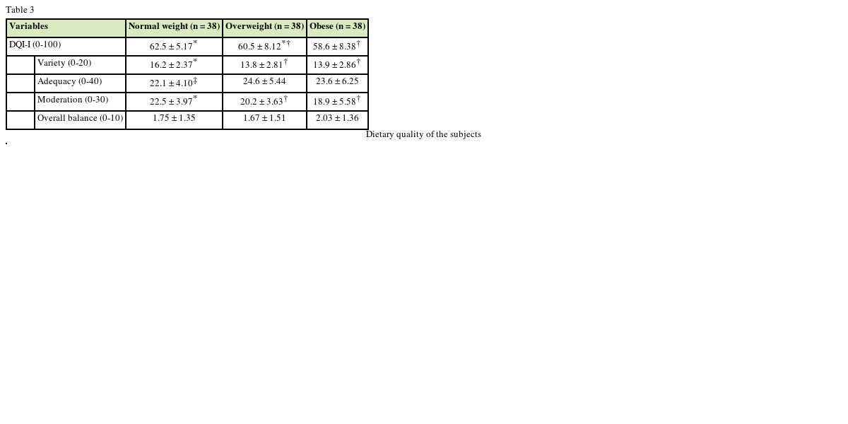 Results regarding that dietary quality was evaluated for the groups are shown in Table 3. Overall the score of DQI was significantly lower in obese group (58.6 ± 8.38) (p < 0.05). Energy intake was significantly higher in overweight and obese (1,651.6 ± 328.61 and 1,761.1 ± 656.62 kcal/day) groups than normal weight group (1406.8 ± 294.33) (p < 0.05). Variety (13.8 ± 2.81, 13.9 ± 2.86) and moderation (20.2 ± 3.63, 18.9 ± 5.58) scores were significantly low in overweight and obese groups than normal weight group.