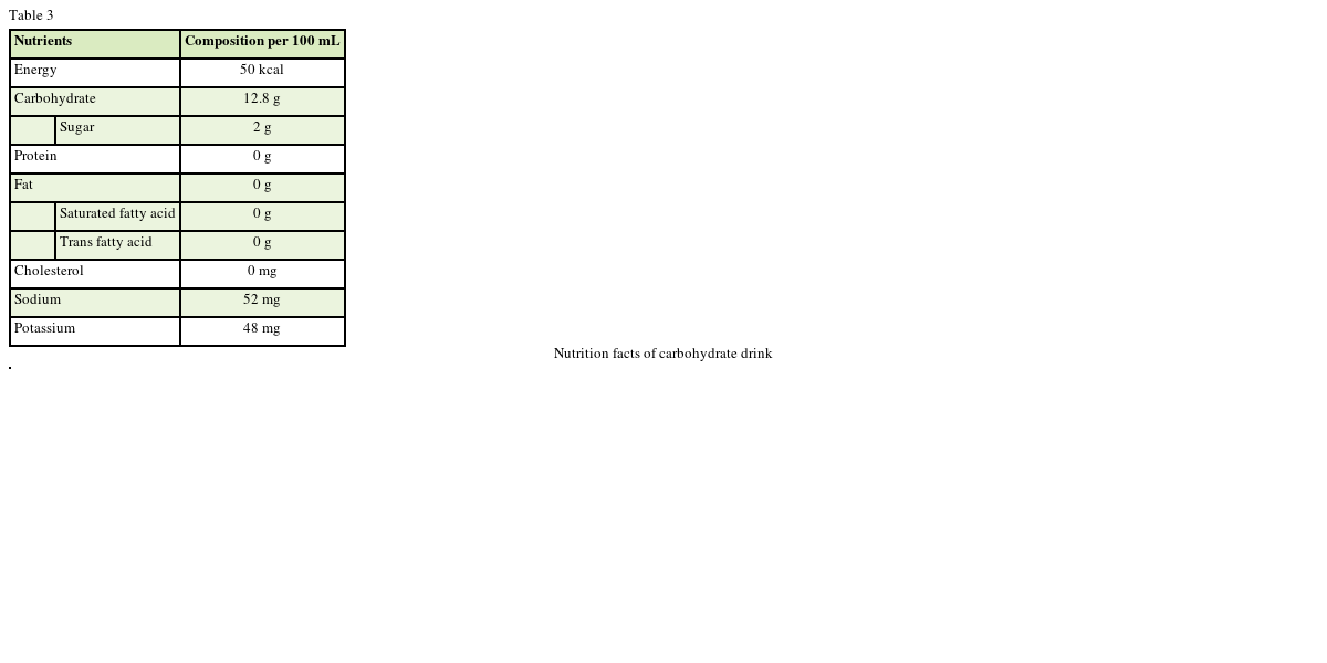 Table 3 Nutrition facts of carbohydrate drink