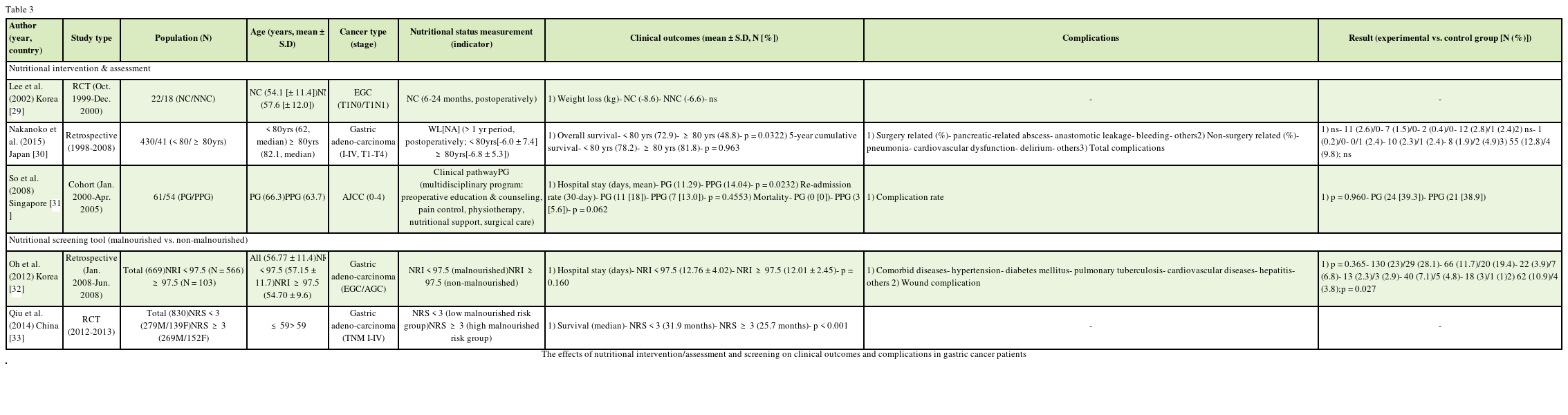 Table 3 The effects of nutritional intervention/assessment and screening on clinical outcomes and complications in gastric cancer patients