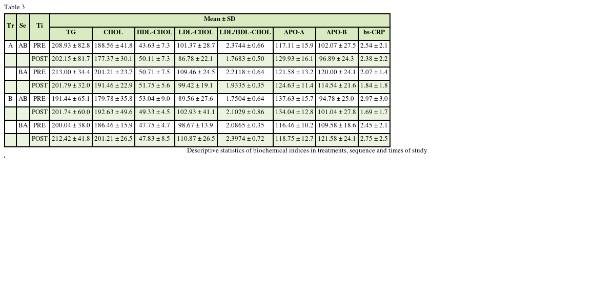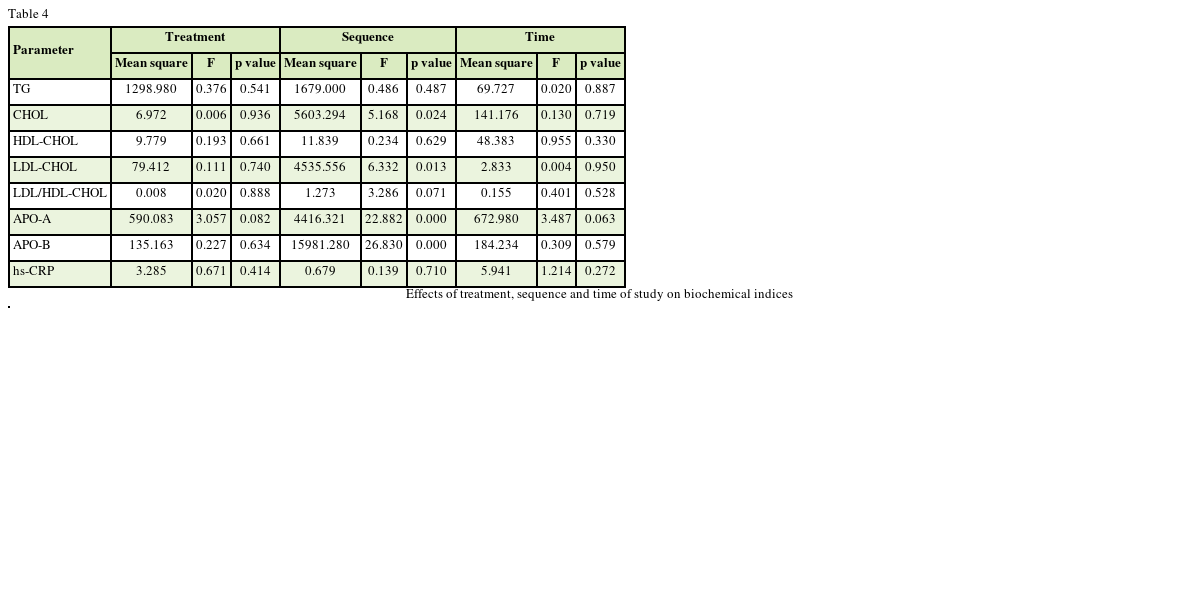 The results showed that treatment, sequence and time have affected blood parameters in MetS patients, but these influences were not mostly significant in many of them. Also, mean of changes in related indices was different based on type of the study effect. The effects of treatment and time were not significant on TG, CHOL, LDL-CHOL, HDL-CHOL, LDL/HDL-CHOL, APO-A, APO-B, and hs-CRP (p > 0.05) but sequence effect was significant on CHOL, LDL-CHOL, APO-A and APO-B (p < 0.05), but was not significant on other parameters (p > 0.05) (Table 4).