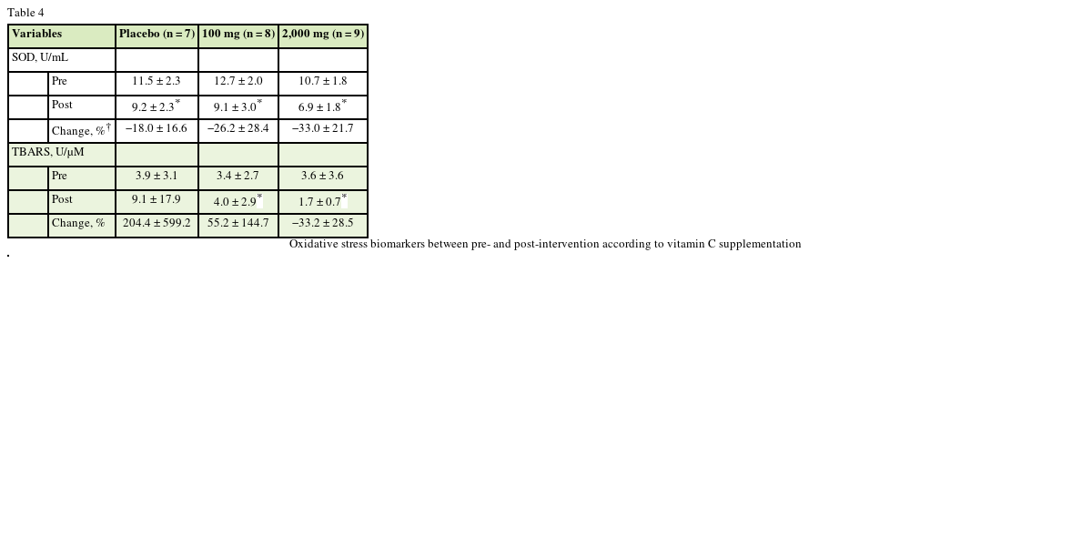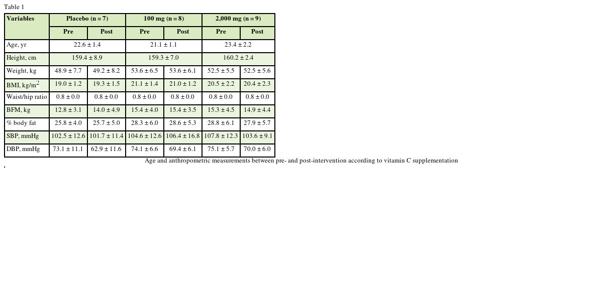 A total of 27 eligible participants were required to take vitamin C supplement or placebo for 4 weeks. All subjects are without any medications or supplements. Total of 27 subjects were divided into 3 groups of which were the placebo group (n = 9), supplementation group of 100 mg/day vitamin C (n = 9), and supplementation group of 2,000 mg/day vitamin C (n = 9) and 24 subjects completed all the necessary requirements. The supplement doses of 100 mg and 2,000 mg vitamin C are considered as safe for subjects. Synthetic vitamin C supplements were supplied from GNC Korea (Seoul, Korea). To be eligible for the study, all subjects agreed written informed consent for participation in the study. The research protocol was approved by the Institutional Review Board (IRB) of the Kyung Hee University (KHSIRB-13-040).