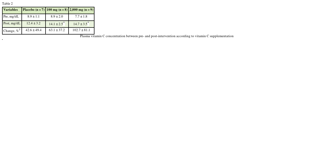 The present study showed plasma vitamin C levels were increased after 100 mg and 2,000 mg of vitamin C supplementation, and plasma vitamin C levels were not significantly different between groups after supplementation. These findings are consistent with other interventions in which supplementation of 30 to 2,500 mg increased plasma vitamin C concentration [