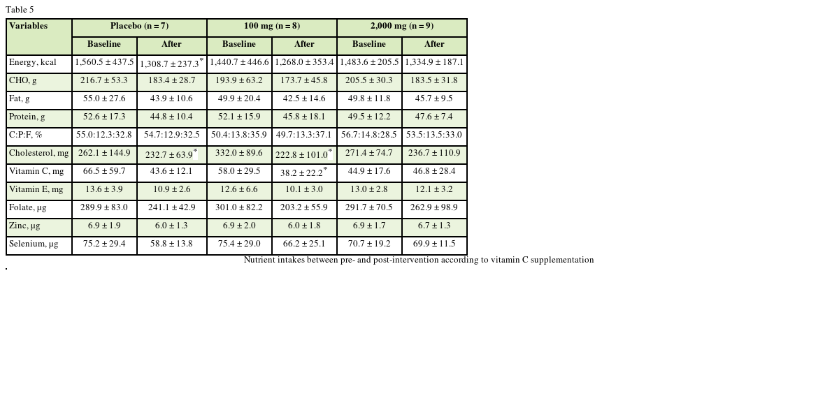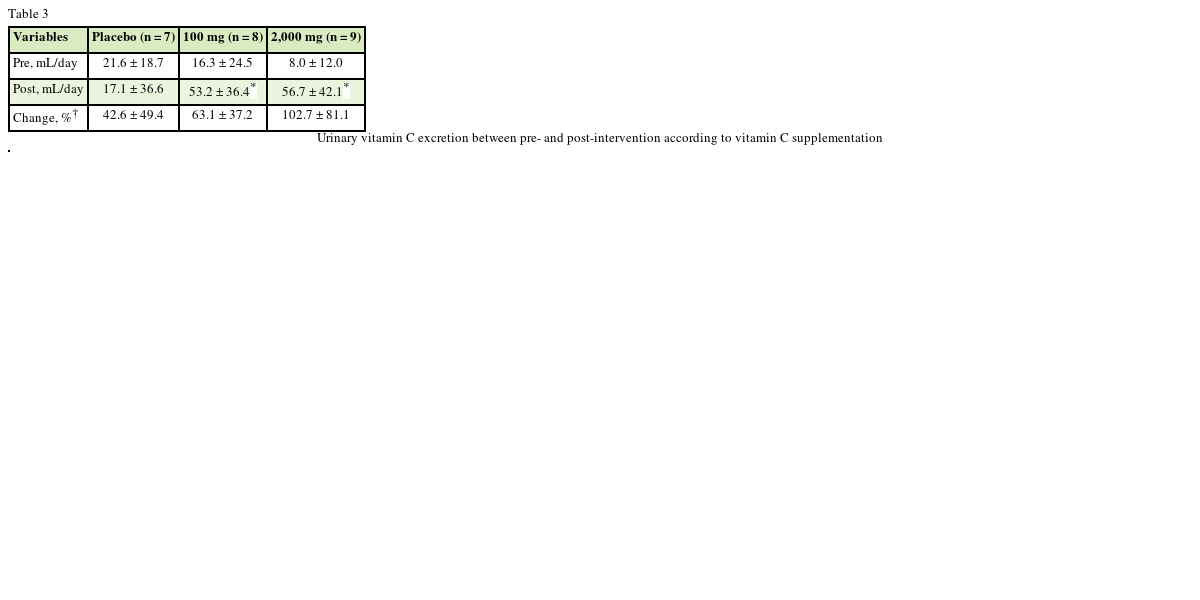 In the present study, while urinary vitamin C excretion was increased after vitamin C supplementation of 100 mg and 2,000 mg, urinary vitamin C excretion was not significantly different between groups after supplementation. Earlier vitamin C study reported that 100 mg of vitamin C as a single dose intake was detected in urine excretion, whereas 60 mg/day vitamin C supplement intake was not urinary vitamin C excretion [