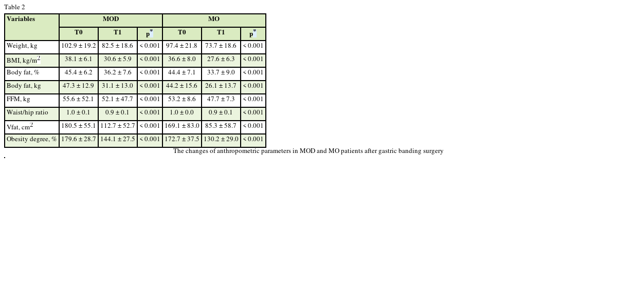 The changes of anthropometric parameters in MOD and MO patients after gastric banding surgery