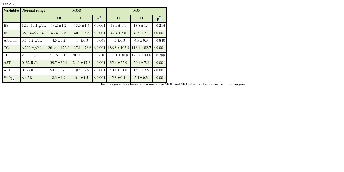 Table 3 The changes of biochemical parameters in MOD and MO patients after gastric banding surgery