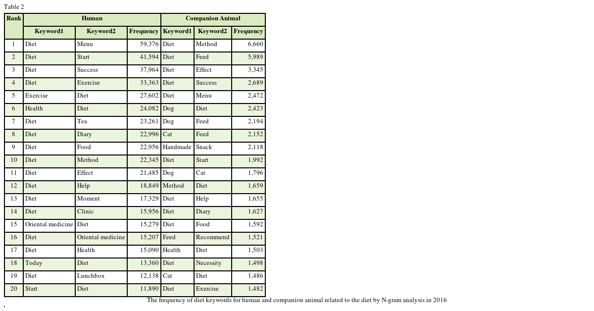 Table 1. The keywords associated with diets for human were shown in order of ‘exercise’ (n = 191,032), ‘eating’ (n = 102,631) and ‘health’ (n = 86,199). The keywords associated with diets for companion animals were shown in order of ‘dog’ (n = 41,629), ‘feed’ (n = 31,068) and ‘cat’ (n = 30,476).
