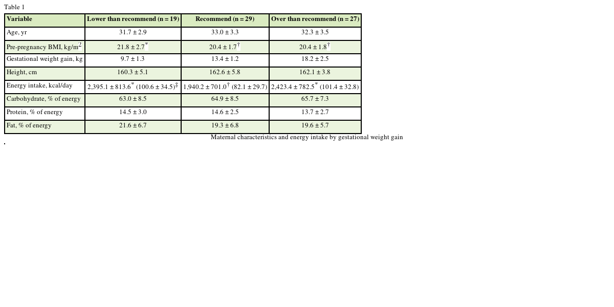 The dietary intake data were checked in person by dietitians to ensure completeness. In comparison to the KDRIs recommended estimated energy requirements (EER) for energy during the third trimester (28–42 weeks), gestational weight gain recommended group was about 18.0% lower than KDRIs [