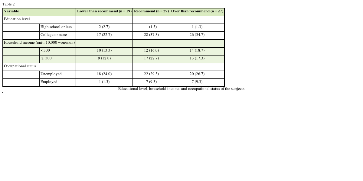 Table 2. Ninety-five percent of the subjects hold a college degree. Over 3,000,000 won for household income is 52.0%, full time employed status is 19.9%.