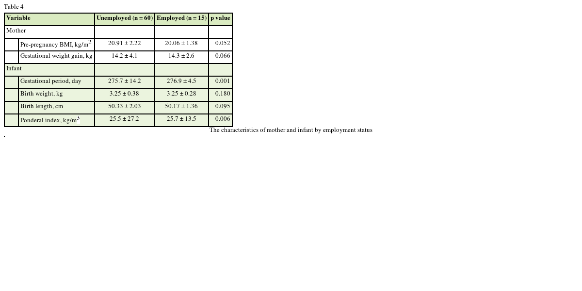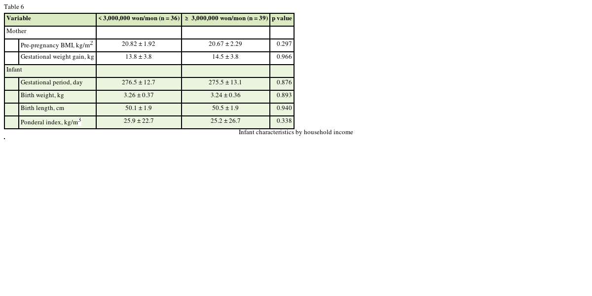 Seventy-five women (aged 25–40 years) giving birth to term infants at 2 months postpartum were recruited as part of a community-based residing in Daegu. None of the women studied reported consuming alcohol and cigarettes at any time during their pregnancy. Women completed a demographic questionnaire. Information was obtained on maternal age and self-reported height and pre-pregnancy weights, education level and household income. Weight at birth (kg), length at birth (cm), ponderal index (kg/m